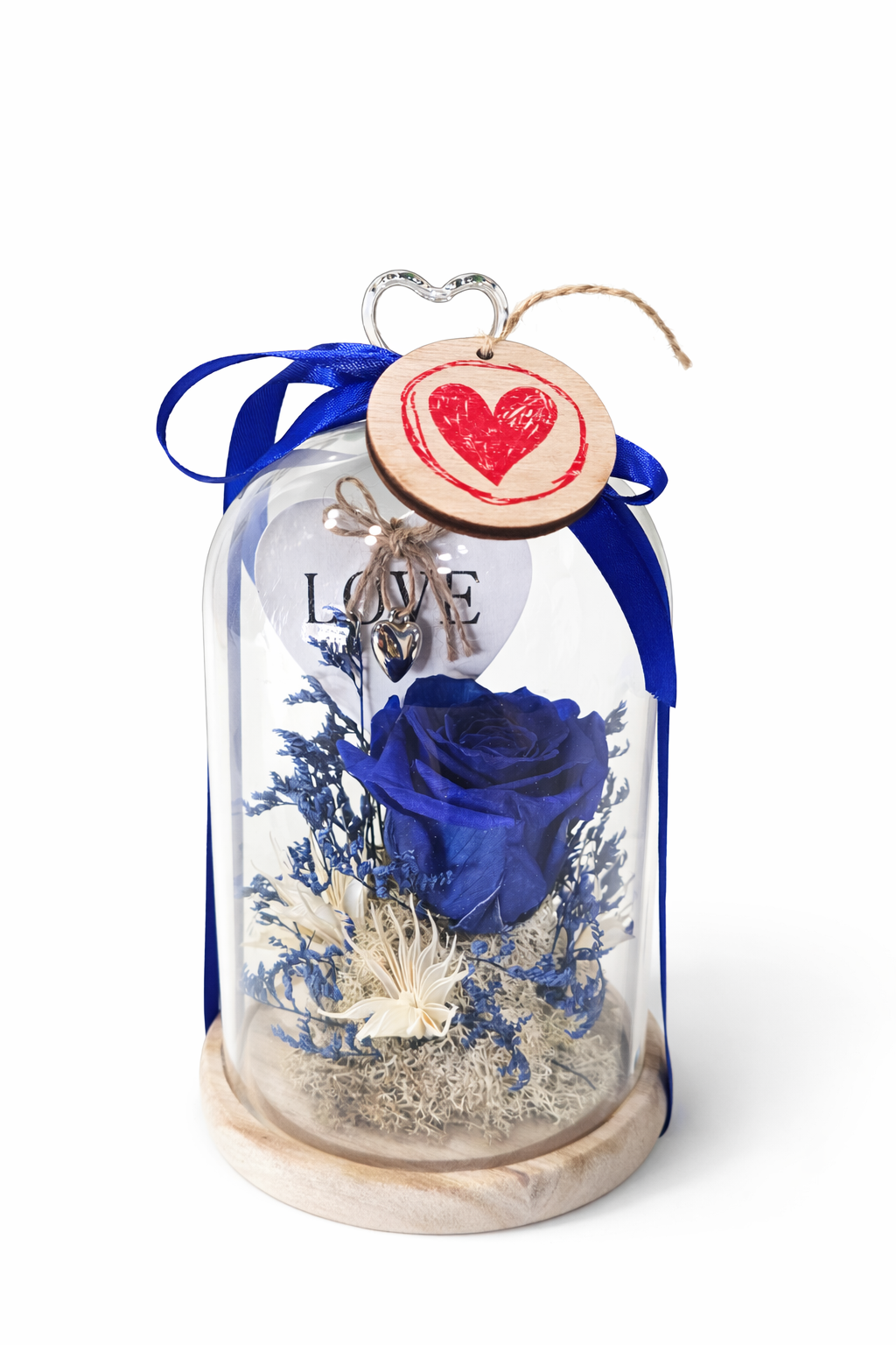 Esta delicada cúpula de cristal guarda en su interior una rosa preservada azul, símbolo de amor eterno y serenidad. Acompañada de elementos florales preservados y presentada sobre una base de madera natural, es una pieza decorativa pensada para durar en el tiempo sin necesidad de mantenimiento.